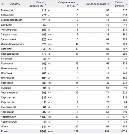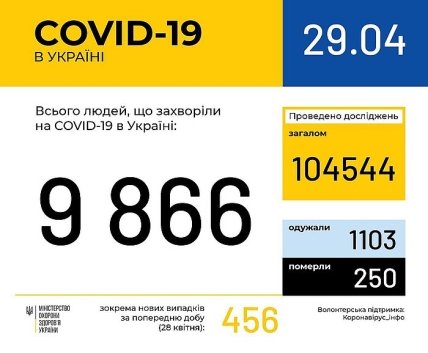 По состоянию на утро 29 апреля в Украине лабораторно подтверждено 9866 случаев коронавируса COVID-19, из них 250 летальных, 1103 пациента выздоровели.