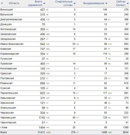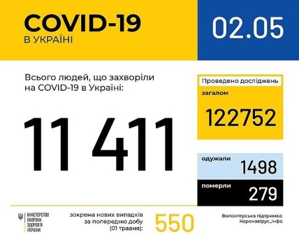 В Украине за сутки подтвердили 550 случаев коронавируса, таким образом количество больных увеличилось до 11 411. Болезнь подтверждена в 771 ребенка и 2250 медиков. В результате осложнений, вызванных болезнью, умерли 279 человек (за последние сутки - семь), из них 17 медработников.