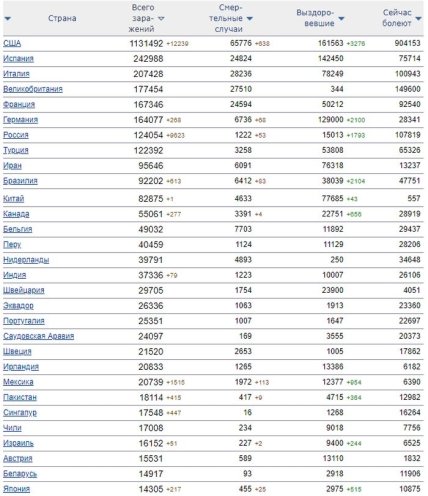 По количеству подтвержденных случаев и умерших в результате пандемии коронавируса прежнему лидируют США. Там коронавирус подтвердили у 1 131 492 человек, из которых 65 776 умерли и 161 563 - выздоровели.