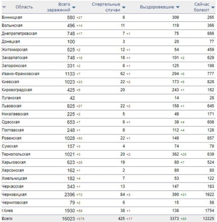 09:30 За минувшие сутки лишь в одной области Украины количество выздоровевших от коронавирусной болезни Covid-19 превысило количество заболевших и количество болеющих таким образом там возросло.