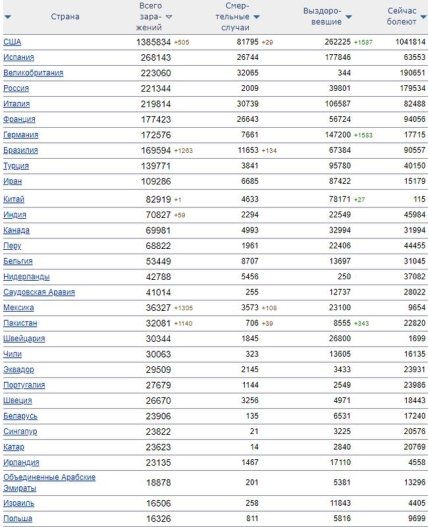 Лидером по количеству зарегистрированных случаев инфицирования являются Соединенные Штаты. Там заболели 1 миллион 385 тысяч человек, из которых умерли почти 82 тысячи и 262 тысяч вылечились.