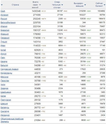 Всего в мире, по данным университета, на 08:00 четверга насчитывалось 4 млн 347 тыс. 921 инфицированных Covid-19, рост за сутки составил 85 тыс. 870 случаев заражения. За последние сутки количество случаев коронавируса в мире увеличилось на 88 тысяч. Излечились более 1,5 млн человек.