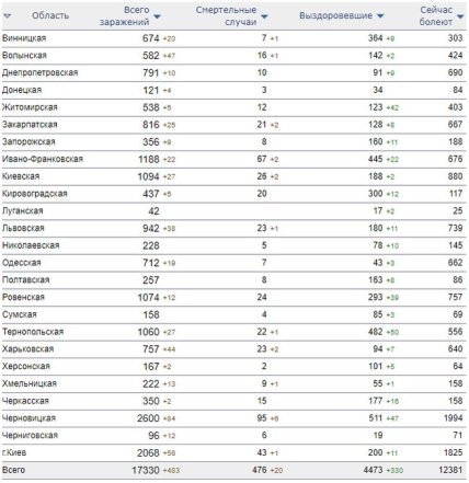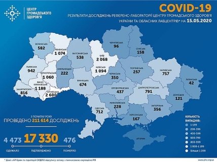 Заражение коронавирусом по областям Украины на 15.05.2020
