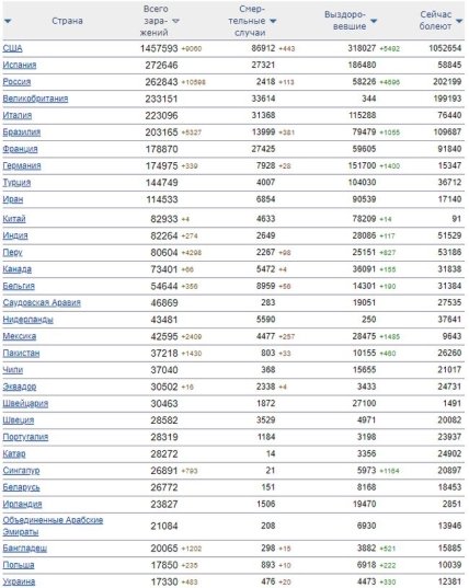В тройку лидеров по количеству больных входят США (1 457 593 лица), Испания (272 646) и РФ (252 245). На четвертом месте – Великобритания (233 151).