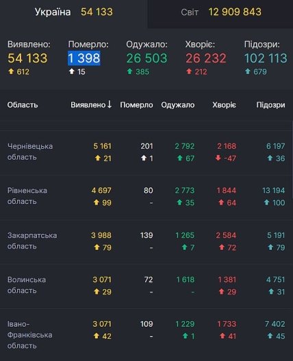 13 июля коронавирус в Украине подтвердили еще в 612 человек. Всего с начала эпидемии новый вирус выявили у более чем 54 тысяч человек.