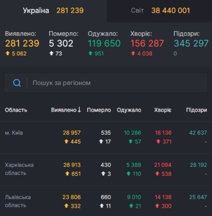 По состоянию на утро 15 октября в Украине официально подтверждены 281 239 случаев коронавирусной инфекции. За последние сутки зафиксированы 5062 новых случая.