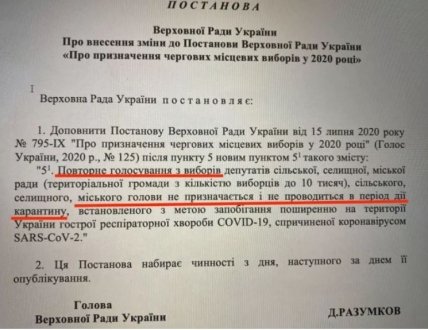 "Повторное голосование по выборам депутатов сельского, поселкового, городского совета (территориальной общины с количеством избирателей в 10 000), сельского, поселкового, городского головы не назначается и не проводится в период действия карантина, установленного в целях предотвращения распространения на территории Украины острой респираторной болезни COVID -19, вызванной коронавируса SARS-CoV-2 ", - так должен звучать новый пункт, уточняется в проекте документа.