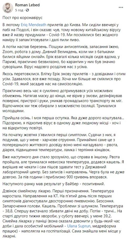 Своей подробной историей знакомства с COVID-19 он поделился на страничке в Фейсбуке.