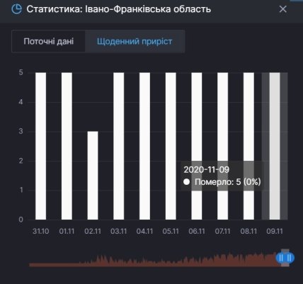 Рекордное для своей области количество смертей от коронавируса зафиксировано на 9 ноября в Ивано-Франковской области. Здесь 9 дней из 10 ежедневно умирает по 5 человек.