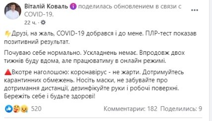 Есть заболевшие и среди главы областей и городов. К примеру, диагноз подтвердился у председателя Ровенской ОГА Виталия Коваля, об этом он написал на Facebook. Коваль уточнил, что он чувствует себя нормально, и две недели проведет дома, но будет работать он-лайн.