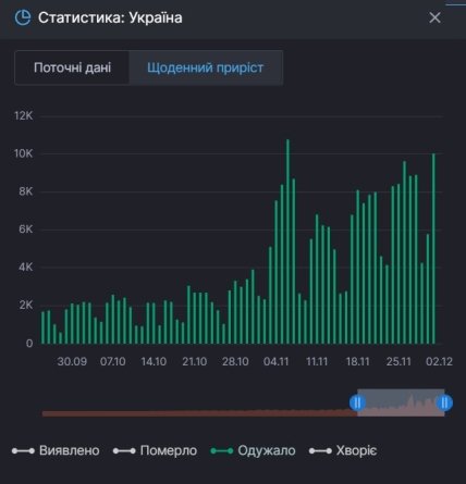 На 2 декабря, за сутки добавился 13141 новый случай коронавирусной болезни. В то же время, за прошедшие сутки выздоровело больше украинцев, чем заболело.