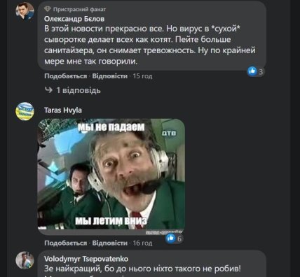 “Зеленський китайцям коронавірус подарував. Плата за вакцину.”, “Пейте больше санитайзера, он снимает тревожность”, “Зе найкращий, бо до нього ніхто такого не робив”, “Украина идет особым путем” - пишут в сети.