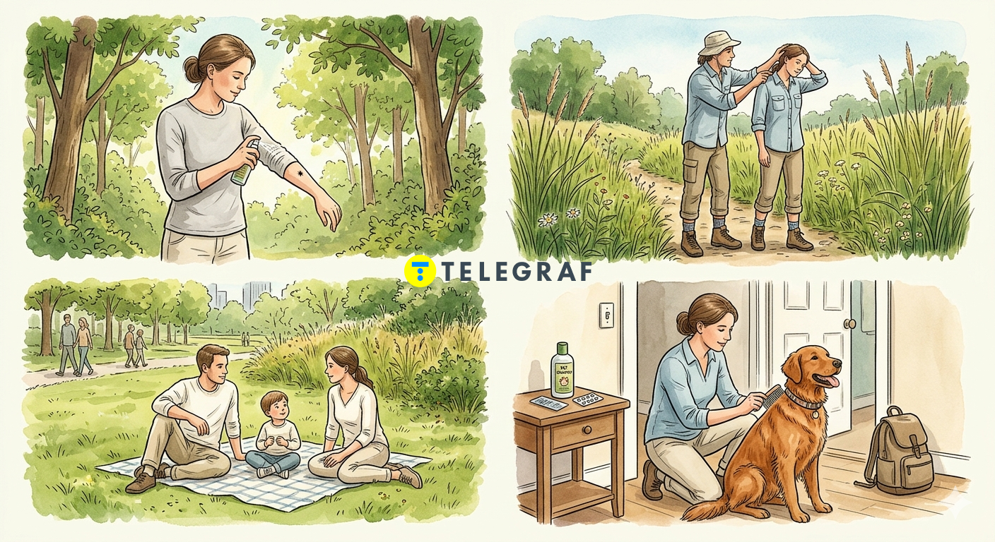 - Закрывать ноги, избегать наклонов в высокой траве и проверять волосы.
