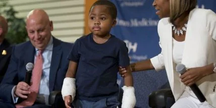 Сион Харви (Zion Harvey) столкнулся с тяжелым сепсисом еще в младенческом возрасте. Результатом этого стало развитие полиорганной недостаточности и ампутация кистей рук и ступней ног. Также Сион в четырехлетнем возрасте получил материнскую почку. Одиннадцатичасовую операцию по трансплантации кистей провели ранее в этом месяце, но прессе о ней рассказали только сейчас. Сион Харви уже доказал, что способен шевелить пальцами.