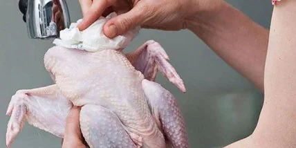 Ученые заявляют, что перед приготовлением не нужно промывать куриное мясо, поскольку во время ополаскивания проточной водой патологические микроорганизмы не смываются, а наоборот попадают еще и на поверхность раковины или посуды, в которой мыли курицу. В большинстве случаев куриное мясо может содержать бактерии сальмонеллы, которые могут погибнуть только при температуре свыше 165 градусов по Цельсию, поэтому специалисты советуют уделять больше внимания термообработке. По такому же принципу не стоит мыть филе рыбы.