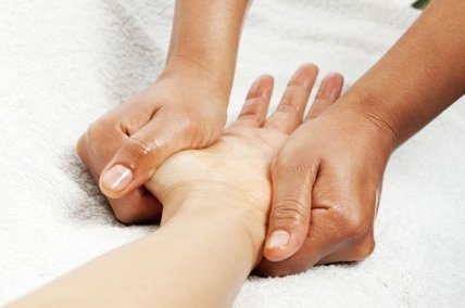 Поместите большой палец левой руки на внутреннюю поверхность правой руки. С внешней стороны кисти левым указательным пальцем осторожно разминайте каждую из трех «борозд» между пястными костями, двигаясь снизу вверх по направлению к пальцам. Закончить массаж следует растиранием и поглаживанием всей кисти. Затем так же помассировать другую руку. Процедуру рекомендуется проводить несколько раз в день в спокойном состоянии.