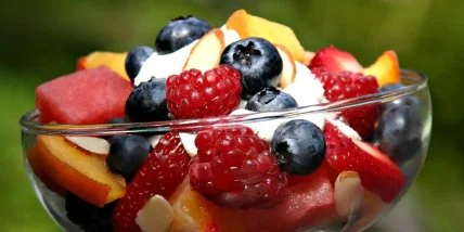 Салат из фруктов – это то блюдо, которое готовится за 2 минуты, не отходя от стола и его можно съесть сразу же, пока сохраняются все витамины. Фруктовые салаты, рецепты которых можно найти в интернете, не требуют заправки, и поэтому считаются лучшими десертами для похудения. Как сделать фруктовый салат – очень просто. Возьмите любимые фрукты, порежьте крупными кусочками и слегка сбрызните лимонным соком, и ваш салат готов! Фруктовый салат является идеальным ужином для тех, кто не ест после 18:00 и для тех, кто старается соблюдать вегетарианскую диету или пост.