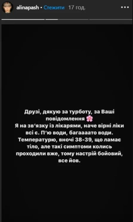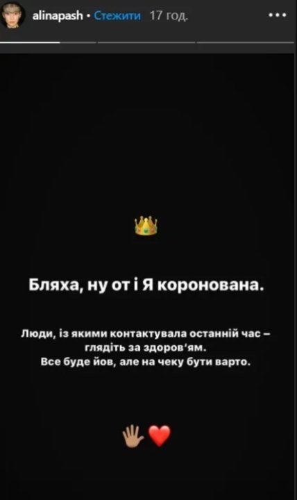 В одной из сторис Alina Pash написала на черном фоне, что "коронована" и попросила людей, с которыми она общалась в последнее время, быть внимательными к своему здоровью.