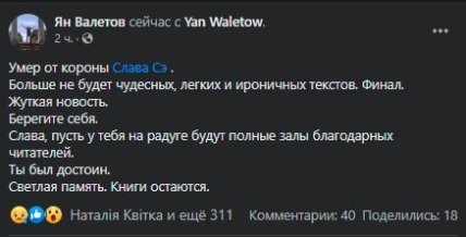 "Обещал станцевать на мои 80": Влад Яма поделился воспоминаниями о Чапкисе (видео)"Умер от короны Слава Сэ . Больше не будет чудесных, легких и ироничных текстов. Финал. Жуткая новость. Берегите себя. Слава, пусть у тебя на радуге будут полные залы благодарных читателей. Ты был достоин. Светлая память. Книги остаются", - написал Валетов в соцсети.